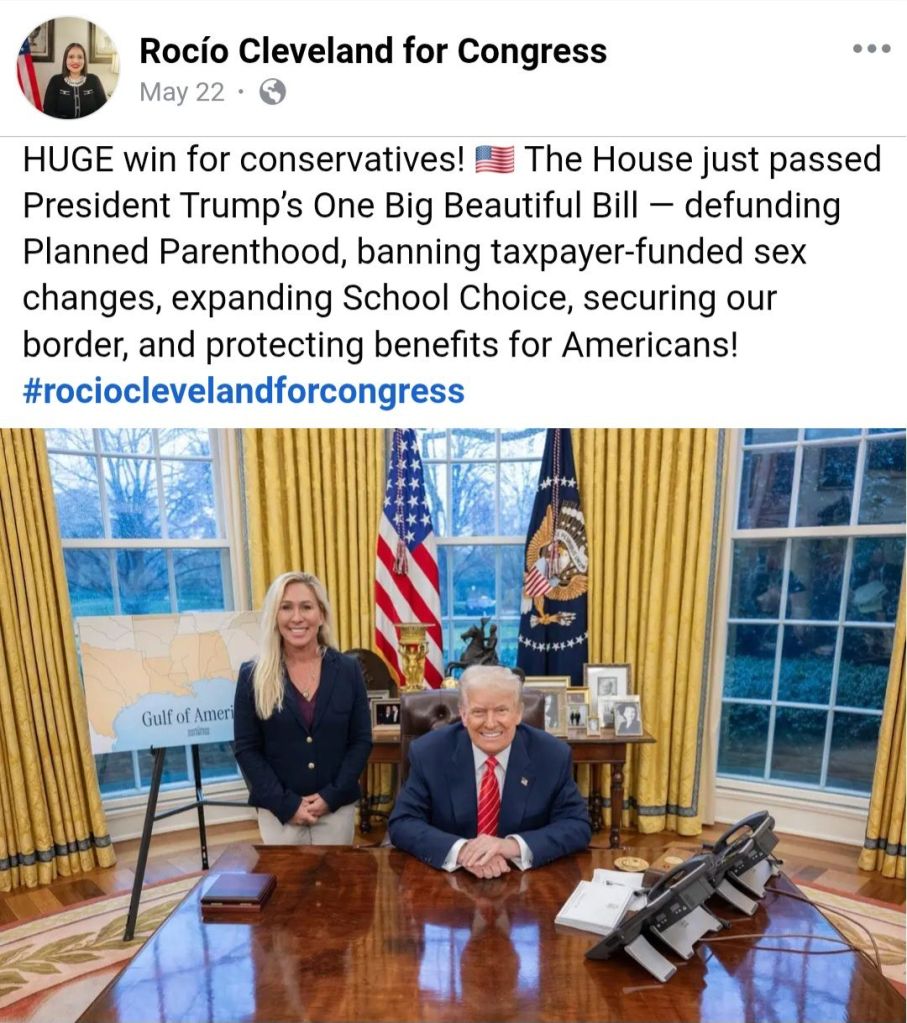 9th District Congressional Republican candidate in Illinois celebrating Big Beautiful Bill that will wipe out healthcare for millions on her campaign Facebook, while simultaneously seeking funds from her community to cover her husbands medical bills through a GoFundMe page.